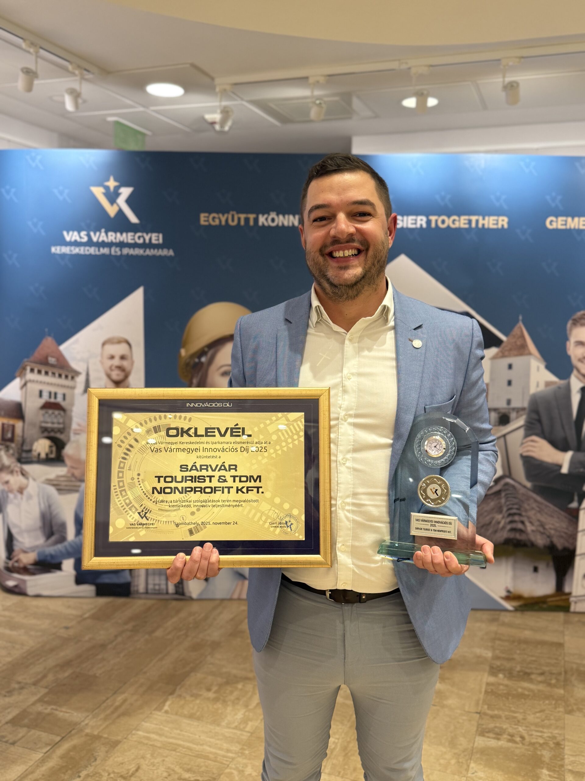 Vas Vármegyei Innovációs díjat nyert a A Sárvár Tourist & TDM Nonprofit Kft. Az elismerést a Vas Vármegyei Kereskedelmi és Iparkamara ítélte oda a turisztikai szervezet egyedi fejlesztésű online marketing kampányaiért. A díjat Haller Ferenc ügyvezető vette át a kamara évértékelő üzleti fórumán.